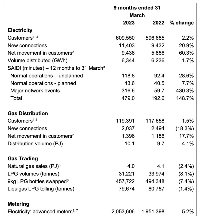 SAIDI minutes for normal operations for the twelve months ended 31 March 2023 is unfavourable compared to last year and exceeds the regulatory threshold. Vector, along with other EDBs impacted by Cyclone Gabrielle, is in a dialogue with the Commerce Commission given the exceptional conditions. We note these results are preliminary and subject to audit.