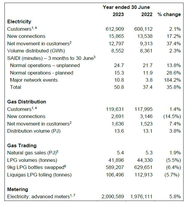 7. On 30 June 2023 Vector completed the sale of a 50% interest in its New Zealand and Australian metering business to investment vehicles managed and advised by QIC Private Capital Pty Limited. Given the sale, we will not be disclosing installed meter numbers in future operating statistics market releases.