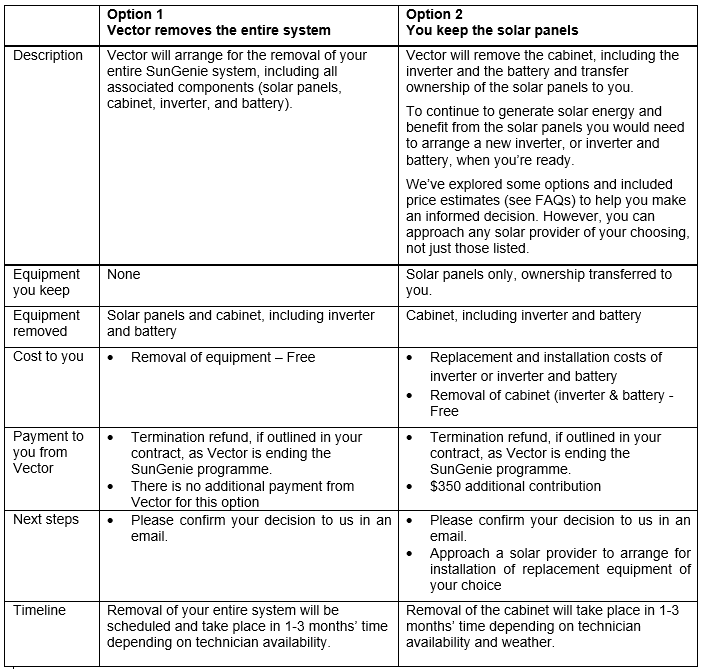 Vector will remove the cabinet, including the inverter and the battery, and transfer ownership of the solar panels to you, on an “as is, where is” basis in full and final settlement. To keep using the solar panels, you would need to arrange and pay for a new inverter with a new supplier separately, when you're ready.